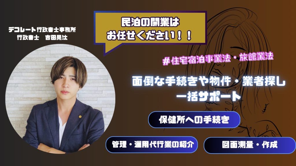 デコレート行政書士事務所の吉田晃汰と申します。弊所は東京23区を初めとした全国での民泊新法・旅館業法の手続き代行のご依頼を引き受けております。
