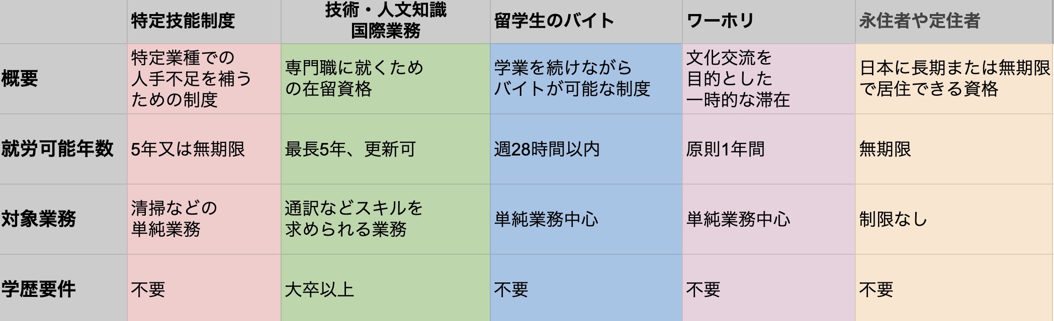 ②仕事内容によって取得できる在留資格が異なる